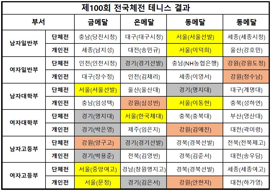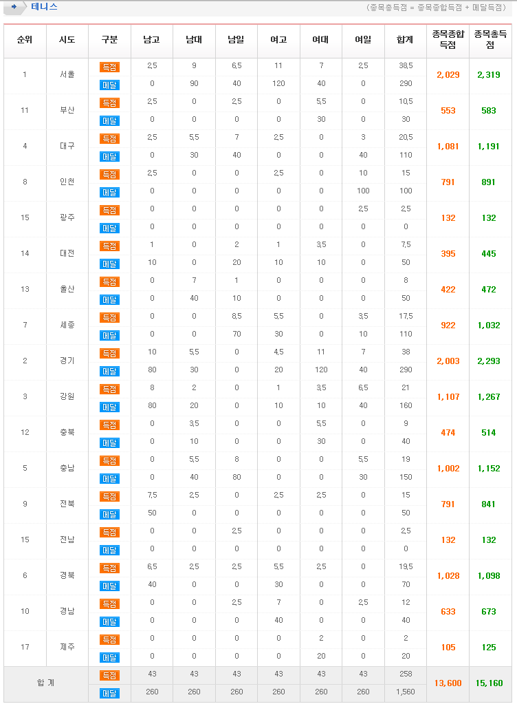 ¡®Á¦100ȸ Àü±¹Ã¼À°´ëȸ¡¯ ´Â Áö³­ 4ÀÏ(±Ý)ºÎÅÍ 10ÀÏ(¸ñ)±îÁö 7Àϰ£ ¿Ã¸²ÇÈ Å״ϽºÀå(ÀϹݺÎ, ´ëÇкÎ), ÀåÃæÀåÈ£ Å״ϽºÀå(°íµîºÎ)¿¡¼­ ¿­¸° °¡¿îµ¥ ¼­¿ïÀÌ ÃÑÁ¡ 2,319Á¡À» ȹµæÇϸç Á¾ÇÕ ¿ì½ÂÀ» Â÷ÁöÇϰí, °æ±âµµ´Â 2,293Á¡À¸·Î ÁØ¿ì½ÂÇÏ¿´´Ù.